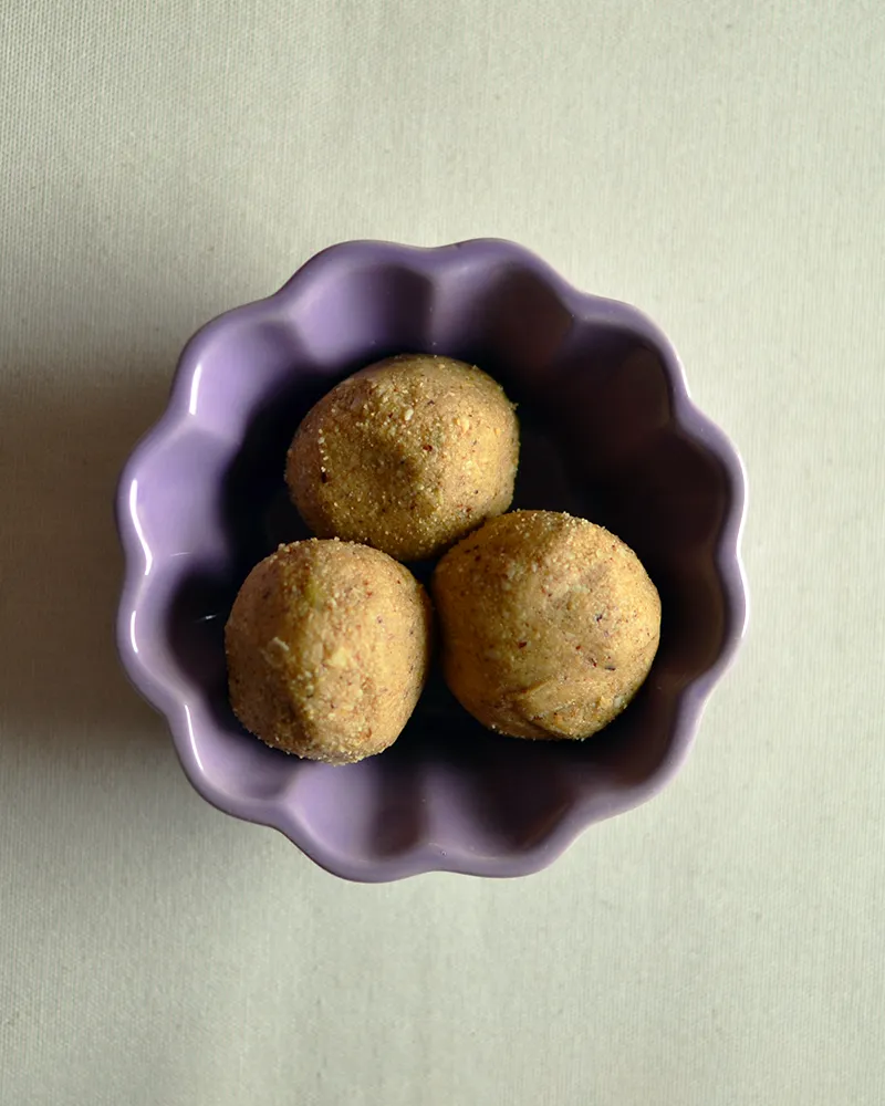 Our panjeeri laddu is made with desi ghee, suji, shakkar (sugar-free is also available), badaam, akhrot, pista, kaaju, phool makhanay, kishmish, khopra, chaaron maghaz, chaaron goondh.